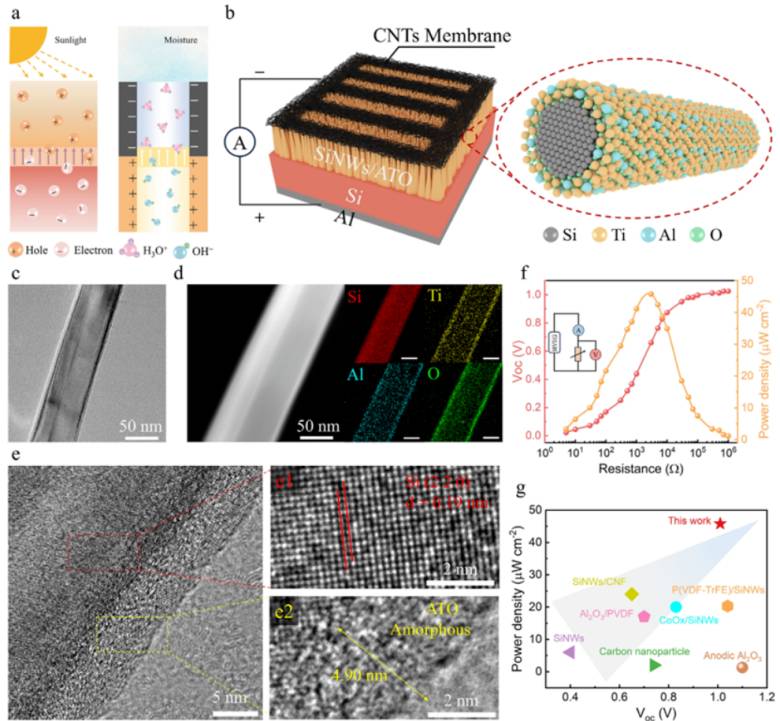研究借鉴半导体 p-n 结光伏效应与纳米流体离子二极管整流效应,构建了由多孔 CNT 膜顶电极、SiNWs/ATO 阵列功能层、Al 底电极组成的器件(如图 1)。实验确定12 μm为 SiNWs 最优长度,ALD 沉积的 ATO 为 4.9 nm 非晶层,与 SiNWs 共形包覆且无晶界,有效抑制界面缺陷。长期稳定性测试显示,器件在 50±5% 相对湿度下连续运行 100 h,电流密度仍保持初始值的 81.3%,远优于传统 SiNWs 基 HEG,且无明显结构退化。
