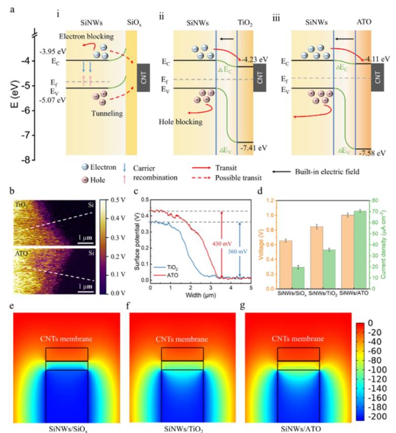 通过 UV-vis、UPS 表征确定 Si、TiO₂、ATO 带隙分别为 1.12 eV、3.18 eV、3.47 eV,并构建能带排列图(如图 3a)。SiNWs/ATO 异质结的导带匹配性更优,电子转移能垒更低,且价带偏移达 2.51 eV,空穴阻挡效应更强;SKPM 测试显示其表面电势差达 430 mV,内建电场强于 SiNWs/TiO₂。TRPL 测试表明,SiNWs/ATO 载流子寿命达 46.94 ns,远高于 SiNWs/SiOₓ(19.94 ns),ATO 有效钝化了界面陷阱,减少电子俘获。COMSOL 模拟验证了 SiNWs/ATO 界面静电势差最大,电荷分离效率最优(如图 3e-g)。