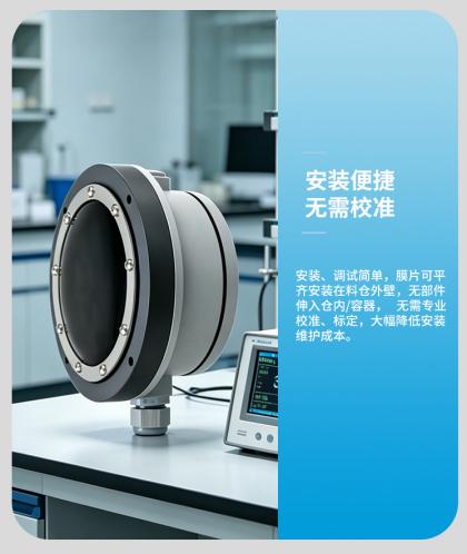 • 安装便捷 无需校准:安装、调试简单,膜片可平齐安装在料仓外壁,无部件伸入仓内/容器,无需专业校准、标定,大幅降低安装维护成本。