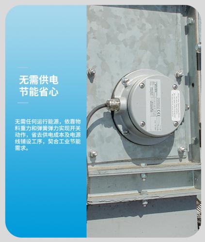 • 无需供电 节能省心:无需任何运行能源,依靠物料重力和弹簧弹力实现开关动作,省去供电成本及电源线铺设工序,契合工业节能需求。