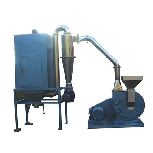 工作原理: (working Method)物料由料斗经螺旋输送器进入粉碎室,被高速旋转的刀片剪切粉碎,通过负压风运的方法把物料运入旋风分离器。袋式除尘器,排出物料达到产品的要求。