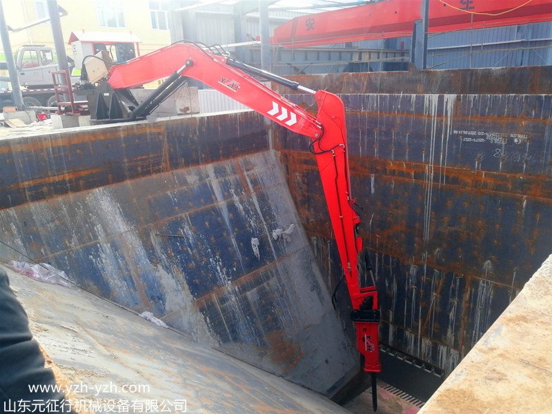 ⑩转锤油缸,尾部铰接在二臂上,活塞杆头部通过连杆同液压锤铰接。并可带动液压锤绕二臂头部铰接点回转。由于运动需要,在二臂与连杆之间装有曲柄。