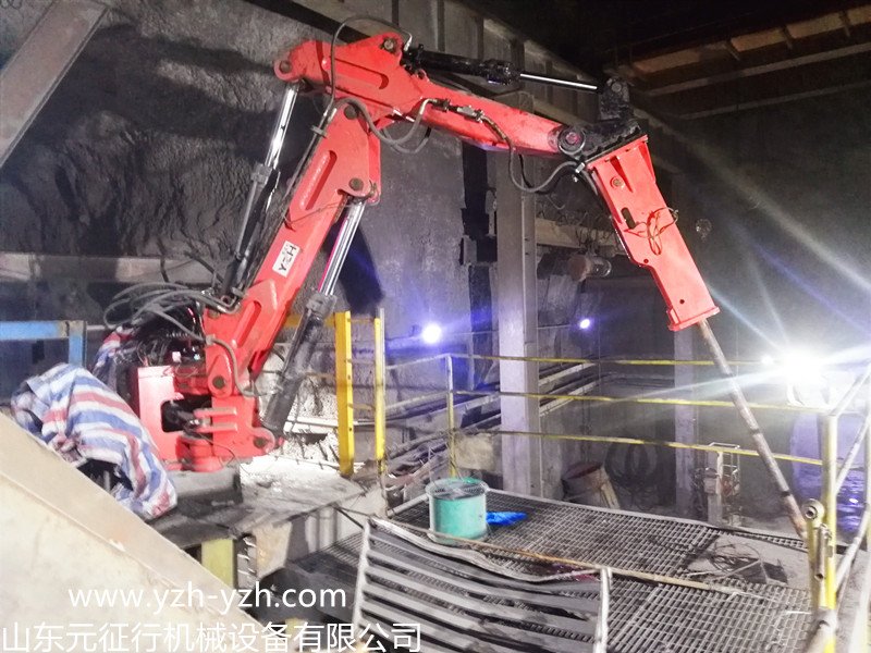 固定式液压破碎机械手是相对于移动破碎机而言的,又叫固定式破碎站。本产品为固定式全液压破碎机,主要用于:冶金、矿山、化工等行业地面现场或井下溜井口格筛处,对大块矿石进行二次破碎,以便运输及提升。该产品是根据破碎现场实际工况自行研研制开发,采用国际先进技术,选用进口液压锤,通过液压—气动控制,破碎能力大、运行平稳、噪声低、性能可靠、操作方便,可在任何复杂工况现场连续作业,减轻工人的劳动强度,改善现场工作环境,提高工作效率,是二次破碎机械化理想设备