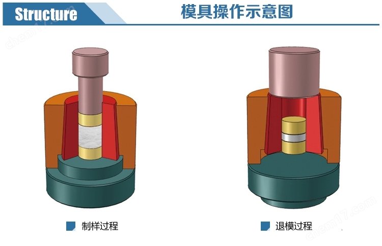 选型指南:圆柱形易退模开瓣模具属于实验室耗材,一般由模具底座、模具内芯(三个瓣)、模具套筒、模具压杆、模具垫片和模具退膜套等六部分组成,接受非标定制各种规格,货期一般为3-20天。常用模具尺寸在Φ3-Φ40mm之间,规格有:Φ3、Φ5、Φ6、Φ7、Φ8、Φ10、Φ12、Φ12.7、Φ13、Φ15、Φ18、Φ20、Φ25、Φ30、Φ32、Φ35、Φ40、Φ100mm等。
