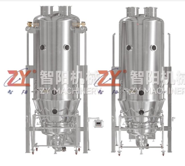 旋流流化床制粒包衣机是将流化床做成叶片式结构的流化床并使叶片呈一定斜度,让气流从叶片的间隙通过。形成环流状的强大气流,使物料呈旋涡状似的有序运动,同时安装在侧壁的气动喷嘴将粘合剂或包衣液喷入呈旋涡状的物料层,从而将粉体制成颗粒或获得连续均匀的衣膜。