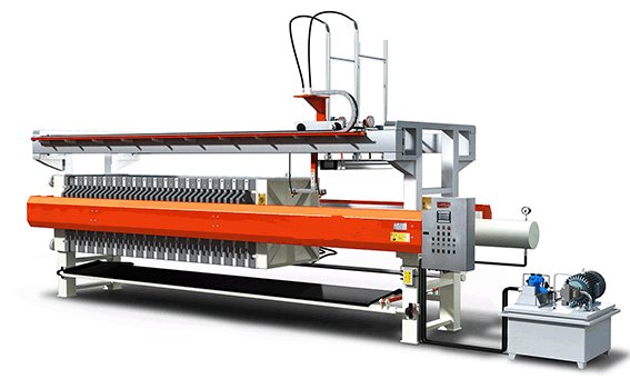 在输料泵的压力作用下, 将需要过滤的物料液体送进各滤室,通过过滤介质,实现固液分离。在滤布上形成滤渣,直至充满滤室形成滤饼。滤液穿过滤布并沿滤板沟槽流至下方出液孔通道,集中排出。过滤完毕,通入清洗涤水洗涤滤渣。洗涤后,通入压缩空气,除去剩余的洗涤液,同时实现无水滤布再生。过滤结束后打开压滤机,通过自动卸料装置,卸除滤饼,重新压紧滤板开始下一工作循环。