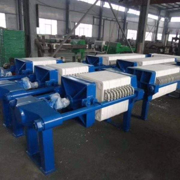 分离效果好,使用方便,广泛用于石油、化工、染料、冶金、制药、食品、造纸及污水处理等各种需要进行固液分离的领域,适用于小型过滤行业,一般使用压力较低,过滤压力小于0.4Mpa的过滤领域。压滤机主要由三大部分组成,即:机架部分、过滤部分、压紧装置。压滤机工作时,转动手轮,通过小齿昏、大齿轮,带动丝杠推动压紧板,将位于压紧板和止推板之间的滤板和过滤介质(滤布)压紧,以保证带有工作压力的被过滤物料(料浆)在滤室内进行加压过滤。(1)机架部分:机架构成压滤机的基础,用以支撑过滤机构、连接其它部件。它主要由止推板、压紧板、压紧部分和主梁组成。(2)过滤部分:是由以一定次序排列在主梁上的滤板和夹在滤板之间的过滤介质(滤布)组成,形成一个个过滤单元(滤室)。(3)压紧部分:它是压滤机的动力装置,主要部件有小齿昏、大齿轮、丝杠等。整机结构设计合理,性能稳定可靠,操作简单,维修方便,适用范围广,是悬浮液分离的理想设备。