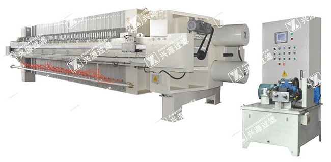 兴源压滤机生产的高效隔膜快开式压滤机采用伺服电机驱动拉板的形式,每组拉4-6块滤板,卸饼速度快,减少了辅助时间,提高了工作效率。