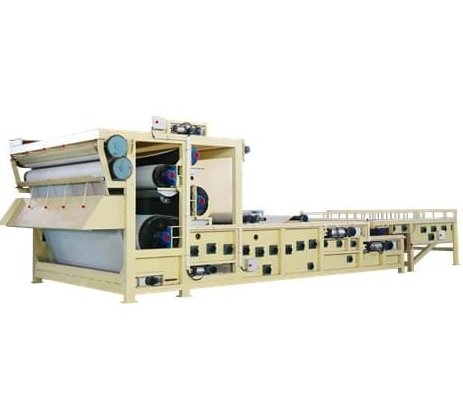 该设备是一种压力过滤设备,通过将两条过滤带缠绕在一系列不同顺序和尺寸的运行辊上,并通过过滤带之间的挤压和剪切来去除浆料中的水分。
