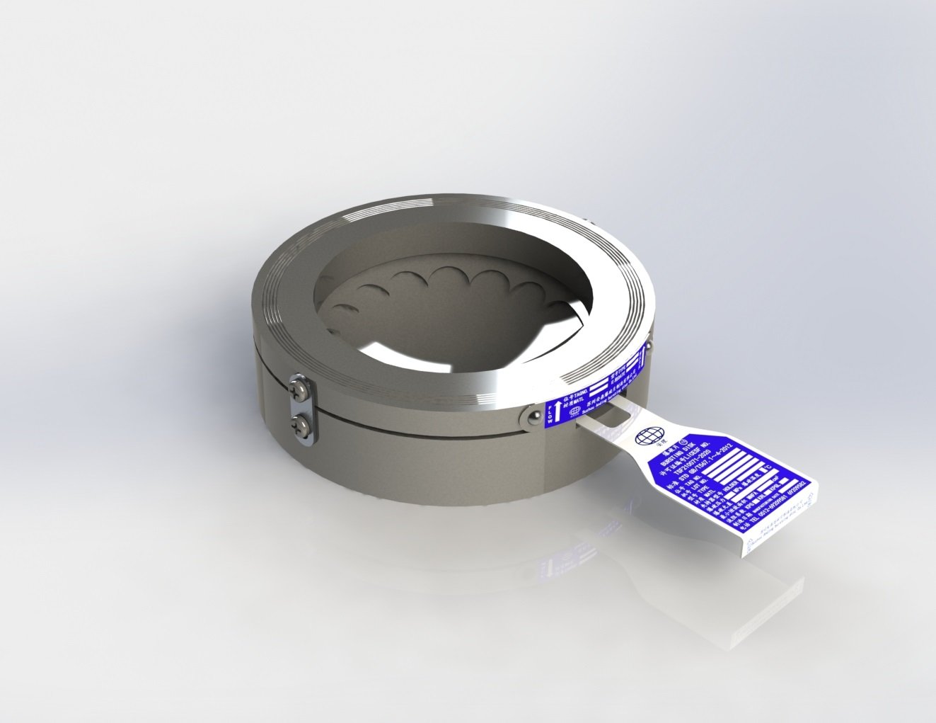 由反拱形金属膜片和环形鳄齿构成的组合式爆破片,凹面接触介质。爆破时,拱形膜片失稳翻转,被锷齿沿周边处剪开,泄放压力。