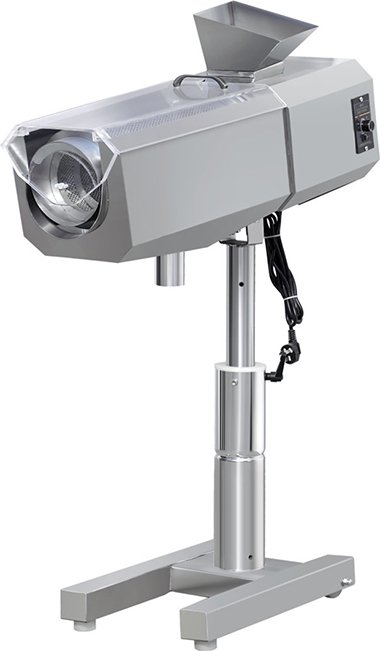 本机采用交流无刷电机实现无级调速,能满足不同产量、不同药品的除粉要求。进料口和出料口高度、角度可在一定范围内任意调节,以适应不同的工作要求;机座底部装有脚轮,可将机器方便地移放到工作地点。本机由进料斗、动力箱、筛片箱、筛鼓、吹扫装置、出料口、机架、调速装置、传动机构等部分组成,片子从进料斗加入到筛鼓,筛鼓由交流调速电机及减速机构组成的动力箱驱动而旋转,片子沿着筛鼓内的螺旋板在圆周下方向出料口传送,筛鼓上的网孔对片子进行温和磨边,压缩空气吹扫装置对片子表面近距离连续吹扫,粉尘在喷射气流、离心力和重力的作用下由筛鼓进行“片”和“粉”分离,同时粉尘随吸尘气流吸入粉尘收集装置内,*终清除片子表面吸附的粉尘和毛边部分。机器可借助升降支杆及锁紧手柄调整进料口和出料口的工作高度和角度。