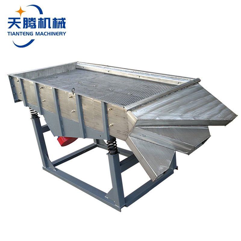 新乡天腾机械设计生产的直线振动筛是常见长方形振动筛分设备,属于通轻型筛分除杂设备,通常简称为直线筛。该筛机从材质上可以分成不锈钢直线振动筛和碳钢直线振动筛两个种类。天腾直线振动筛从筛面的尺寸上又可以分成520型、525型、530型、1020型、1025型、1030型、1220型、1230型、1530型、1540型等等不同型号的振动筛分机,也可以根据用户要求设计生产非标尺寸或非标出料口的直线振动筛分机。