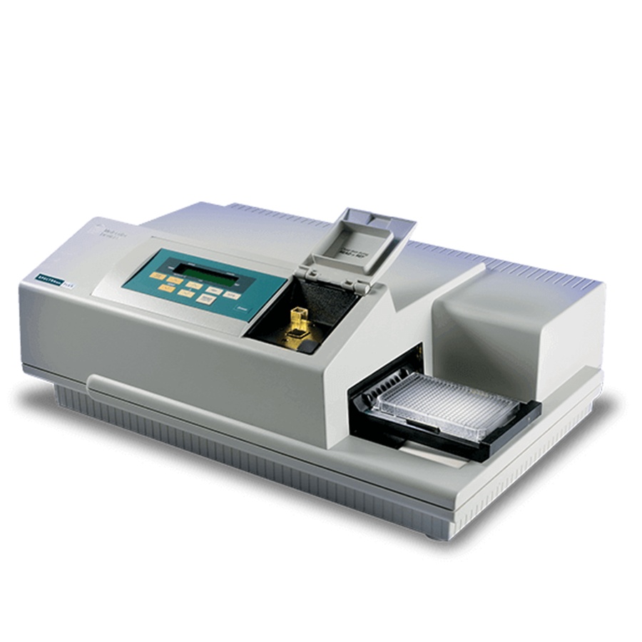 SpectraMax Plus 384 上同时实现标准的分光光度计和微孔板读板仪的功能,它是生命科学研究领域的理想设备,它可以读取任意一种标准规格的比色皿或 12x75 mm 的试管、96或384孔的微孔板中的样品,且检测波长范围覆盖紫外区、可见光区、近红外空气,因为已知根据比尔定律,标准 1cm 光程下 1 OD 相对应的核酸浓度是一定的,但是微孔板由于体积限制,无法达到 1cm 光程,借助于独立的立式比色皿插槽,无需开电脑情况下,可靠快速的定量核酸和蛋白浓度。