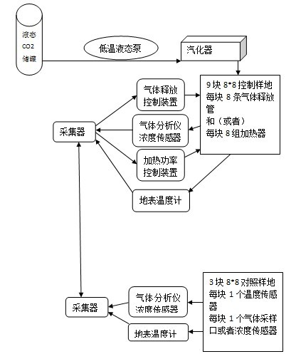 远程控制计算机管理整个平台的运行,设置布气实验时间、气象条件等,可进行CO2浓度/温度设置值或者增强比例/幅度设定,控制样地数据采集器获得对照样地数据采集器的参考数据,对控制量进行运算,通过各种控制器、质量流量计、调压器等进行实施,再通过控制样地内的传感器、分析仪对样地内的温度、气体浓度进行测量,实现反馈、闭环控制。