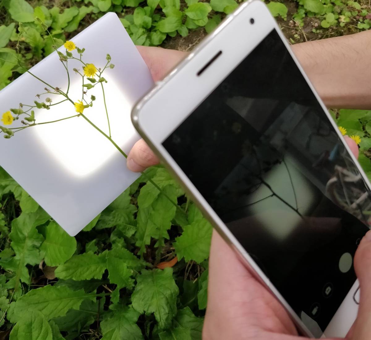 掌式便携背光源放原位活体的枝叉背后,用拍照手机2秒可获取分枝区照片。