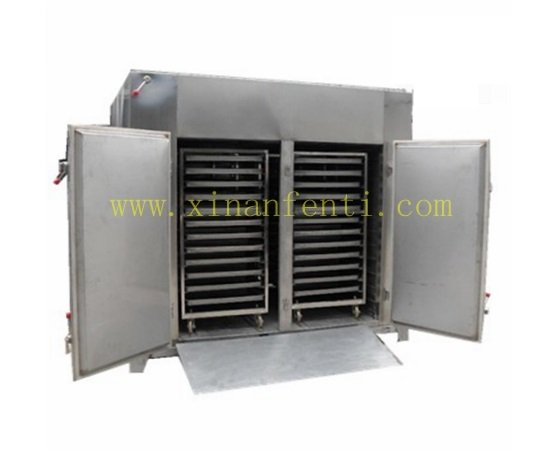 利用强制通风作用,箱内没有可调试分风板,物料干燥均匀。热源可采用蒸汽、导热