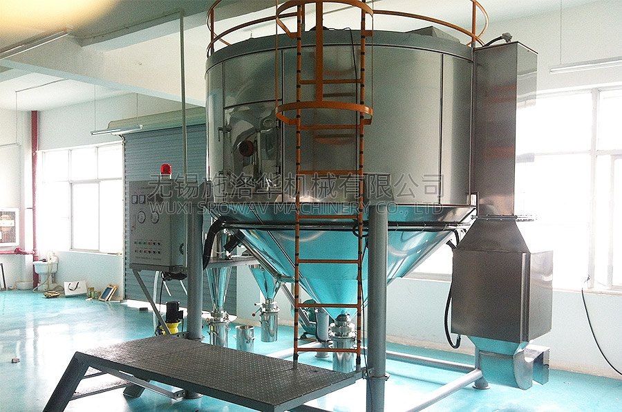 环境空气通过过滤器进入加热装置后,进入干燥室顶部的热风分配器,热空气呈螺旋状均匀进入干燥室。同时料液由供料泵送至干燥室顶部的离心雾化器,使料液喷成极小的雾状液滴,使物料和热空气接触的表面积大大增加,水份迅速蒸发,在极短时间内干燥成粉状产品。