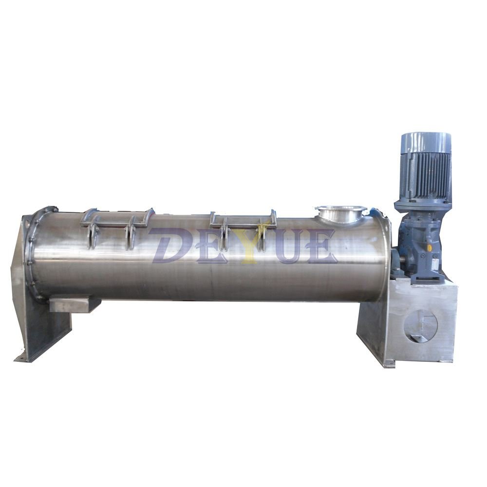 DTHX连续式混合机能进行粉体与粉体、粉体与颗粒、粉体与液体的混合,该设备在圆形或U形筒体内安装不同形式的搅拌叶片,物料从混合机一端进行,在混合机内一边搅拌,一边通过特殊叶片结构向混合机另一端输送,物料一般在混合机内停留30-180秒,达到连续进料、连续出料的过程。