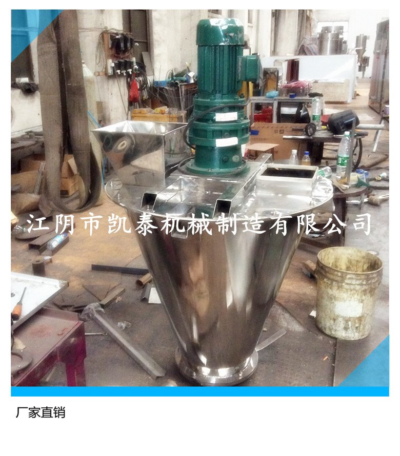 混合机筒内的两只非对称螺旋的快速自转将物料向上提升,形成两股非对称沿筒壁自下向上的螺柱形物料流,转臂带动的螺旋公转运动,使螺旋外的物料不同程度进入螺柱包络线内,一部分物料被错位提升,另一部分物料被抛出螺柱,从而达到合圆周方位物料的不断更新扩散,被提到上部的两股物料再向中心凹穴汇合,形成一股向下的物料流,补兖了底部的空穴,从而形成对流循环。由于上述运动的复合,物料在短时间内获得了均匀混合,混合精度较高。