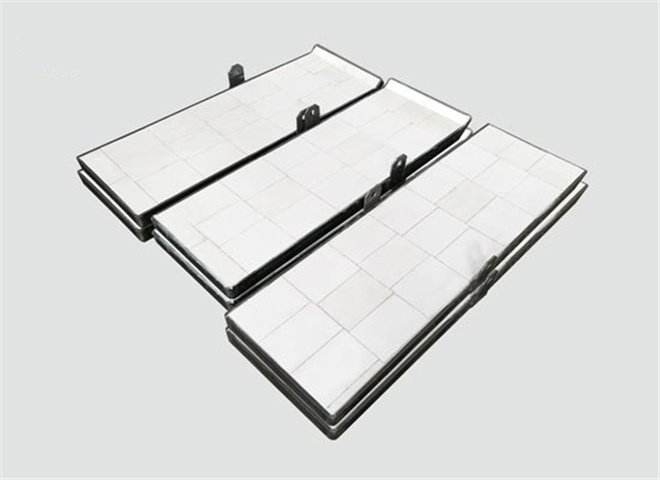 耐磨陶瓷复合钢板是将增韧耐磨陶瓷用高强度有机粘合剂或耐温350℃的无机粘合剂直接粘接钢板槽内,钢板槽带有沉头螺栓,整体衬板形成坚固且有抗冲击力的防磨层,很好地解决大块物料输送过程中的设备防磨问题。适用于高温环境下物料输送设备作防磨内衬,可承受大块物料的冲击。