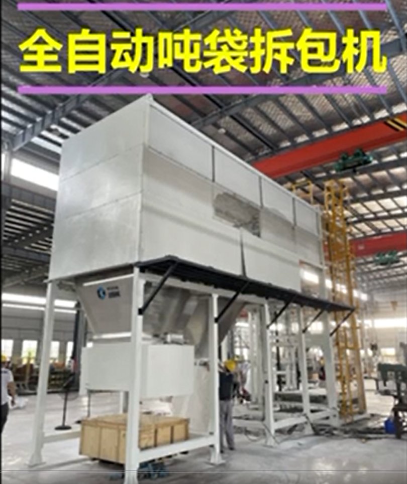全自动吨袋拆包机也叫做自动破袋卸料机是一种高度智能化的机械设备,它能够实现自动化拆包过程,大大减少对人工的依赖。这种设备特别适合于拆包量大的场合,能够高效地处理大量的吨袋物料。通过全自动吨袋拆包机的应用,可以实现无尘化的生产环境,确保生产过程中的清洁和卫生,提升整体生产效率和产品质量。