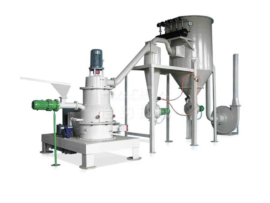 粉碎机主机:粉碎机主机主要由电机、粉碎盘、分级轮、衬板、筒体等组成,物料在风机抽力作用下由分级机下端入料口随上升气流高速运动至分级区,在高速旋转的分级叶轮产生的强大离心力作用下,使粗细物料分离,符合粒径要求的细颗粒通过分级轮叶片间隙进入旋风分离器或除尘器收集,使粗细颗粒分离,细颗粒上升至分级区二次分级,粗颗粒下降至卸料口处排出。分级机叶轮通过变频器调整,并设计了失压保护、过电流保护、料位控制、运行状态监视及报警系统等保护措施。