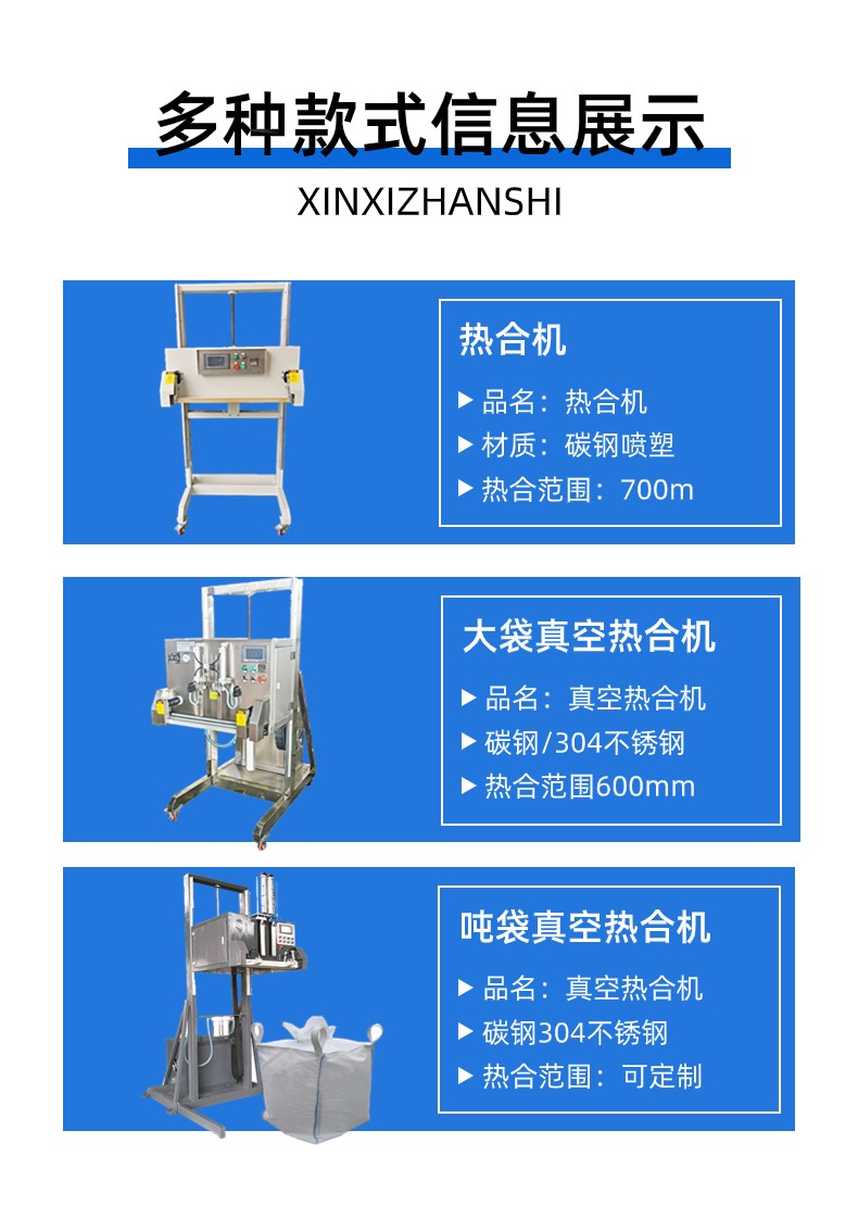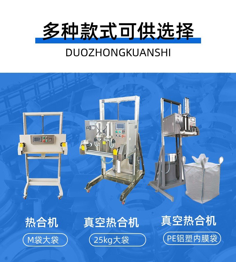 4. 用于塑料或铝箔25kg大袋包装的抽真空封口和直接封口。