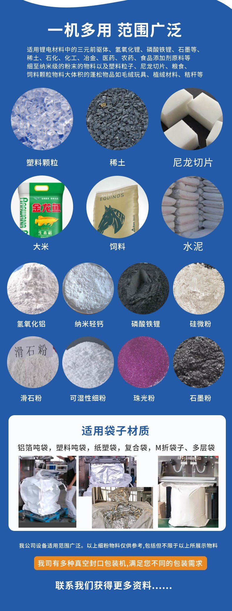 同样适用于三元前驱体、磷酸铁锂、石墨、片碱、苯酐、氯化钾、硫酸钾、硫铵、氧化锌、已二酸、漂粉精等石化、化工、冶金、医药、农药、食品、新能源等行业中各种粉状、颗粒物料封口以及真空包装。