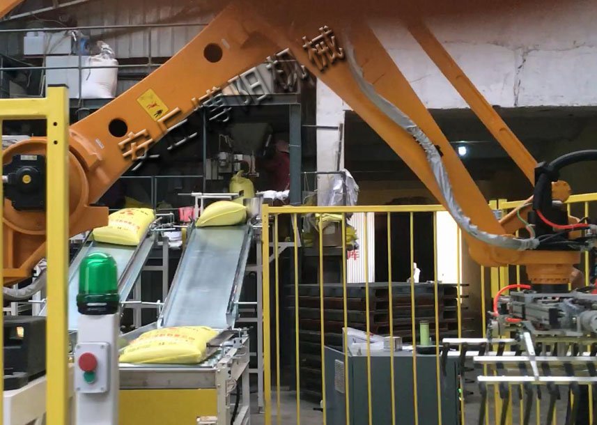 尿素机械臂式码垛机是将已装入容器的面粉,按一定排列码放在托盘、栈板(木质、塑胶)上,进行自动堆码,可堆码多层,然后推出,便于叉车运至仓库储存,是输送机输送来的料袋、按照客户工艺要求的工作方式自动堆叠成垛,并将成垛的物料进行输送的设备。