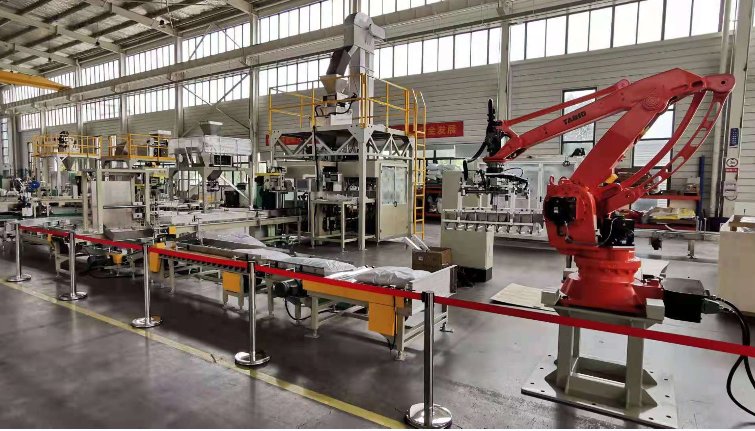 自动套袋→物料称量→填充物料→自动缝包机→输送→机器人码垛。