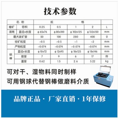 并自行混匀,对磨样粒度控制的安全系数大,样品粉碎以后不需要逐个进行过筛、混匀等繁重且有矽尘危害的操作。自动定三辊四筒棒磨机主要应用于矿石化验室制样使用。碎样主要以磨削力为主,噪音低,特别是对样品中金的破碎效果较好,化验结果稳定,对操作的要求不苛刻。样品在样筒中进行粉碎时器只计实际磨矿时间,中间停电的时间不计入,磨到的时间就自动停机,因配备了故障过电流自动停机的安全保护装置,在磨矿时不需专人在机器旁看守。本机设计了具有特色的取筒、倒样、清扫和排尘装置,明显地减轻了操作人员的劳动强度和矽尘危害。一改过去棒击为棒磨的工艺;采用低噪音排风扇和橡胶辊筒,明显地降低了工作噪音,改善了工作条件。带刷压风机械清扫,清扫干净,避免样品互相污染,清扫产生的粉尘,在扩散之前就在小罩内集中排出,大大减轻了粉尘对人体的危害。棒磨筒采用横担微弹锁紧结构,,锁紧牢靠,操作简便,不漏样。效率高。