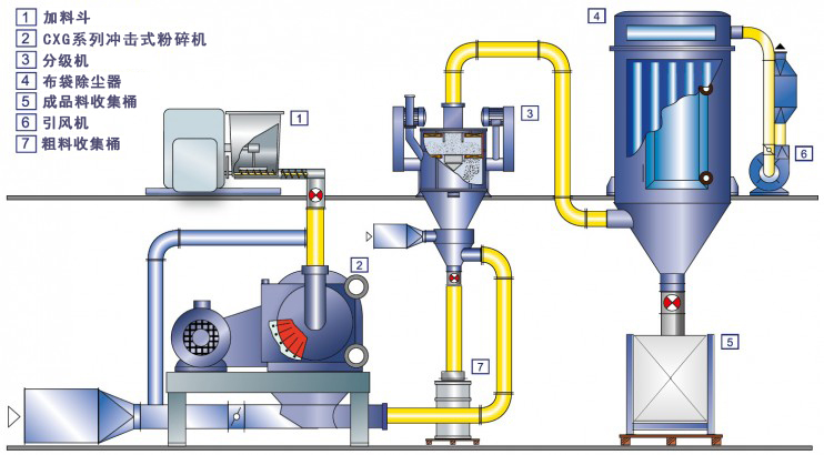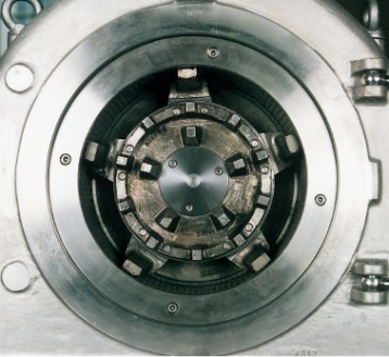 UP系列精磨机适合对软质材料至中等硬度材料进行干式研磨。供给材料被填充至配备有研磨元件的转子中心,随后在转子和定子元件的冲击作用下粉碎,产品穿过研磨区后进入研磨机壳体内,随后在重力作用下从研磨机中排出。转子旋转过程中将产生气流,终端产品在气流作用下被提取并填充至过滤器内。用户可以选用不同的研磨元件,例如钉盘或配备有异形研磨轨道或筛网的板式搅拌器。通过调节转子转速和供给速率可以设置加工的精细度。