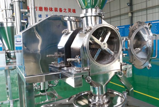 圆柱形的粉碎舱外壳,进料口为圆柱形,可通过卡箍与加料斗的出料管道相连,处于粉碎仓的中心位置,出料口在下方。双层的外壳结构,夹层内可接冷却水。材质为316L不锈钢,内表面镜面抛光处理,外表面亚光处理。