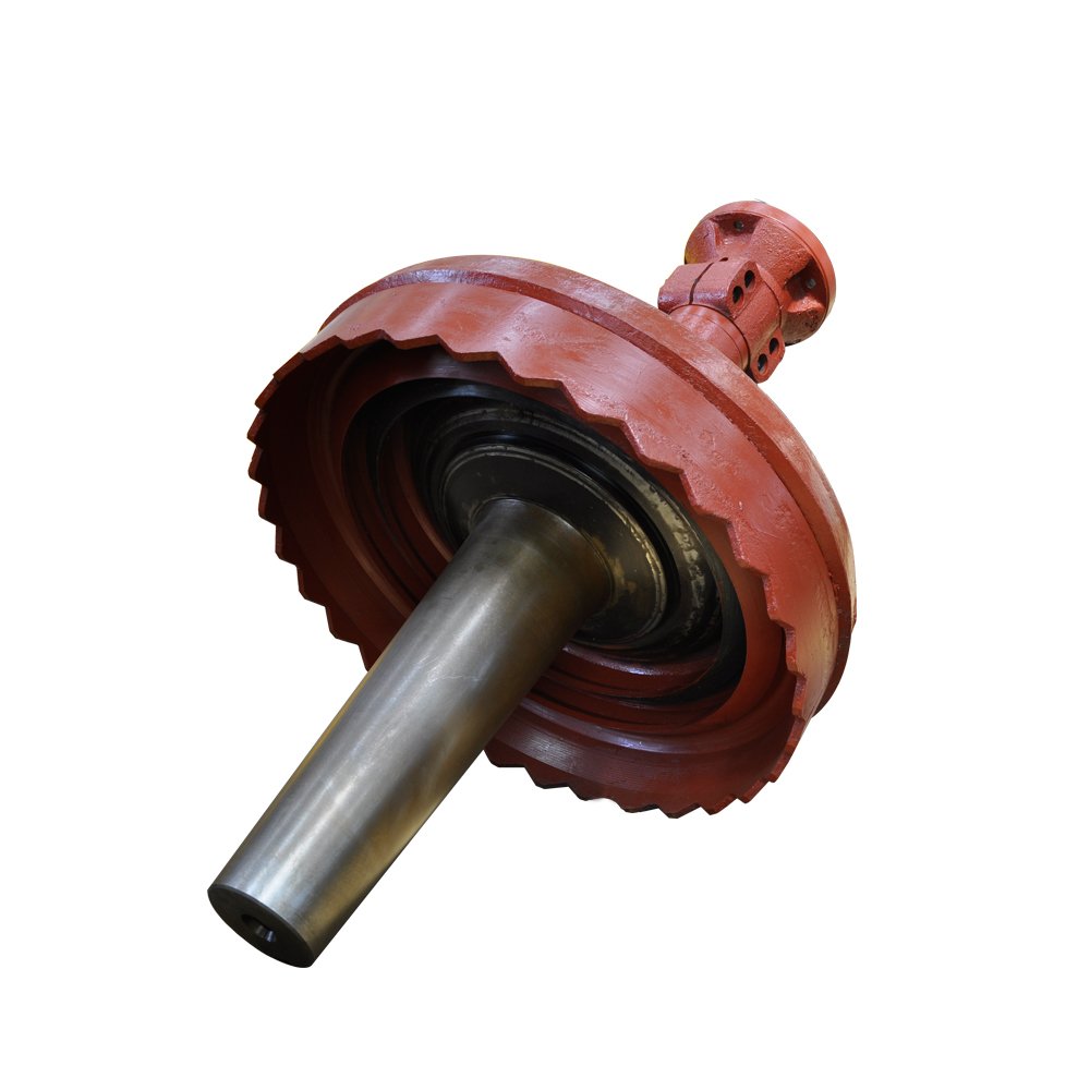 7.机器工作时,电机通过液力联轴器和小锥齿轮带动偏心套底部的大锥齿轮,使偏心套旋转,引起锥体摆动,使物料破碎。破碎机主轴不动,只是一个撒粉的球形瓦,以承受破碎力。由于破碎机主轴不动,偏心套传递破碎力,该结构能承受较大的破碎力,非常适合细粉碎和超细粉碎,因为超细粉碎的破碎力非常大。