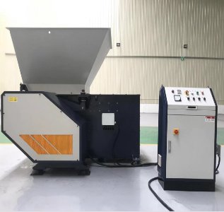 单轴撕碎机主要由刀片主轴、定刀、承载箱体、箱体支架、进料系统、液压推料系统、动力系统,电器控制系统组成的机器。主要用于撕碎木材、橡胶、塑料、纸等废旧物料。