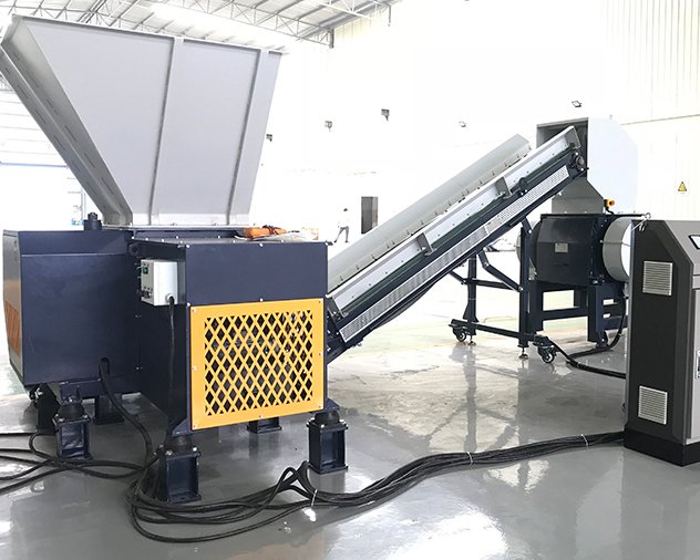 该小型塑料破碎生产线由冈力S600单轴撕碎机+C3560塑料破碎机以及皮带输送机组成。单轴撕碎机对物料进行**道破碎,由皮带输送机运送至塑料破碎机进行第二道破碎,使出料颗粒度尺寸小于10mm。