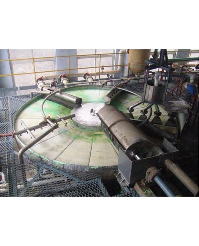 在平盘真空过滤机的过滤面上设有与中心分配阀作业区相对应的料浆布料器将过滤料浆均匀地分布在过滤面上,在真空的作用下,液体通过滤布向下流到真空滤室中,固体在滤布上形成干滤饼,洗涤液用洗涤布料器均匀的分洒在滤饼上进行洗涤,各区相互之间液体不会混流,洗涤完并滤干后的滤饼通过滤面上的螺旋卸料装置将滤饼从内环向外缘推也,掉入渣斗中。残留在滤布上少量的滤饼,在下一个工作循环中,在加料区由中心分配阀通过压缩空气,使之与料浆重新混合。