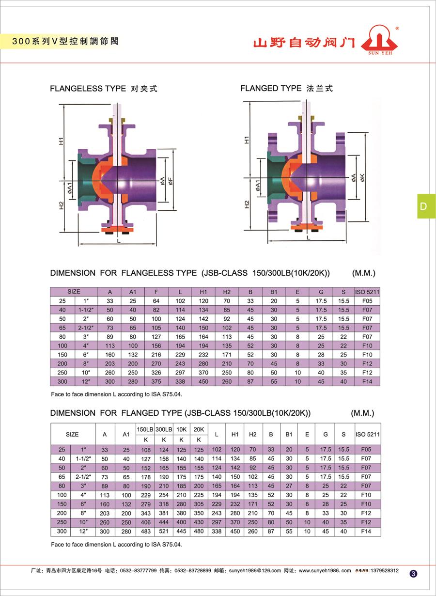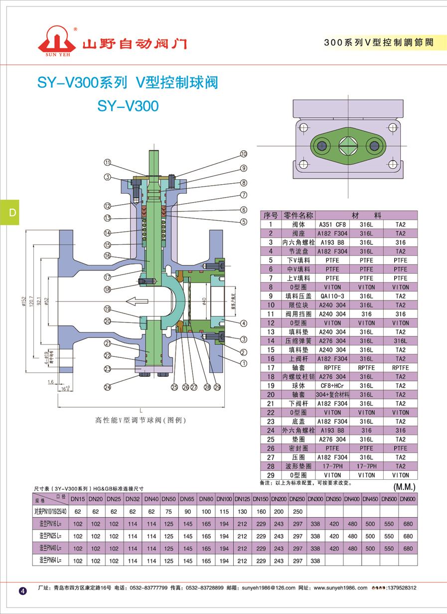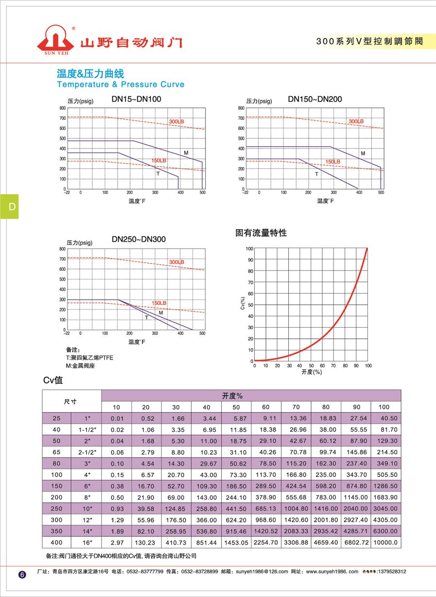 3Y-V300系列V型控制球阀,调节阀的V型切口球面阀板在增大调节比的同时,在截流时对密封环还具有剪切作用。因此,适用于要求大调节比的控制系统,以及对含纤维质流体、料浆类流体的控制,可调比R=300:1,是一种用途广泛的调节阀。