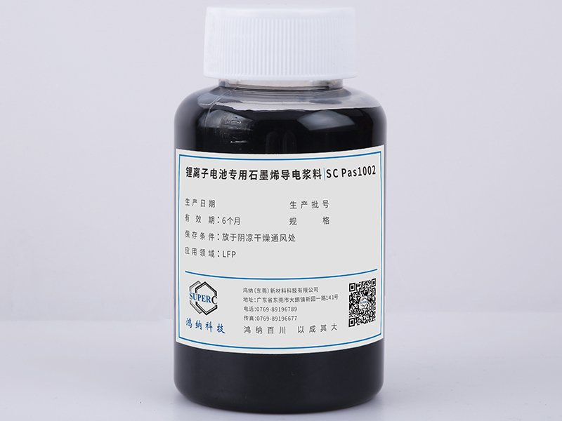 Pas1002是以石墨烯为核心、NMP 为溶剂,添加一定量碳黑类材料的石墨烯复合导电浆料。利用石墨烯优异的导电性、导热性和柔性薄片结构,与高结构的碳黑按照一定比例混合,可在整个材料体系上形成高效的点、线、面接触,构成三维立体导电网络,能够降低电池内阻,提高其充放电倍率和循环性能。