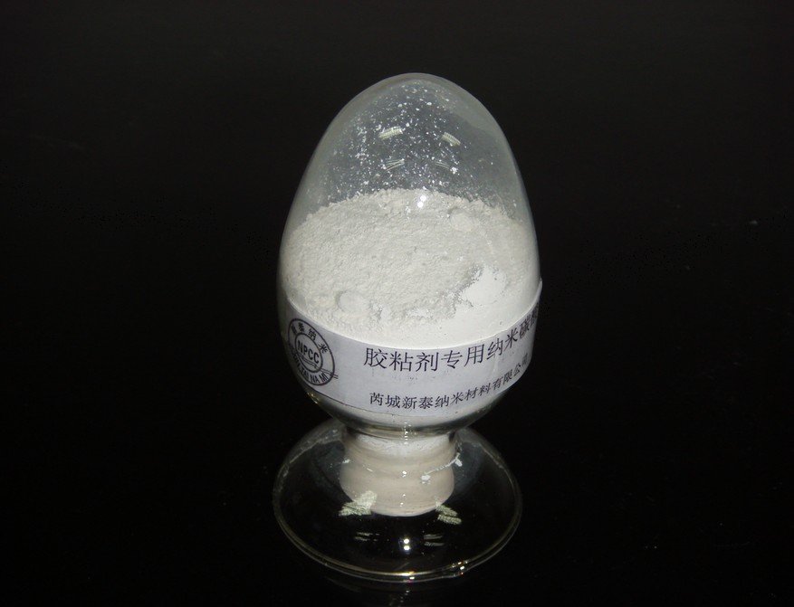4、纳米碳酸钙粒径小(15-90nm)、比表面积大,通过一定的表面处理后粘度稳定、吐出量大、施工性能良好,便于手工和机械手喷胶,在胶粘剂体系中可以作为一种触变剂使用,调节胶粘剂的粘度,防止胶粘剂在垂直面施工时发生下垂,提高其滞留特性。