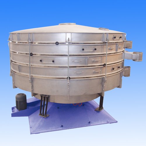 从运行轨迹来看,摇摆筛是一种非线性惯性振动筛,基本的回转运动与人工筛分相类似。偏心率从25到40mm可调,低速V型皮带驱动从120到360rpm可调。每一种产品的停留时间可以通过摇摆筛的径向与切角朝驱动轴线方向进行调整。因此建立水平与抛掷三维翻滚运动。物料从中心到外缘在整个筛面上均匀分散,从而以螺旋运动往轴向传播。细小颗粒从而完成了整个筛分过程。水平与垂直加速度随着粒子的运动而增加,接近筛孔尺寸的颗粒随之成功分离;较大颗料被运送到出口处,出口处由一个可调节的导向装置控制流量中,该导向装置是控制物料停留时间的另一个因素。此次过程在每筛层之间重复进行。