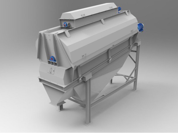 滚筒装置倾斜安装于机架上。电动机经减速机与滚筒装置通过联轴器链接在一起,驱动滚筒装置绕其轴线转动。当物料进入滚筒装置后,由于滚筒装置的倾斜与转动,使筛面上的物料翻转与滚动,使合格物料(筛下产品)经滚筒后端底部的出料口排出,不合格的物料(筛上产品)经滚筒尾部的排料口排出。振打装置根据物料性质可以设定为,间歇式清网或者连续清网,防止筛孔堵塞。以便物料顺利过网。