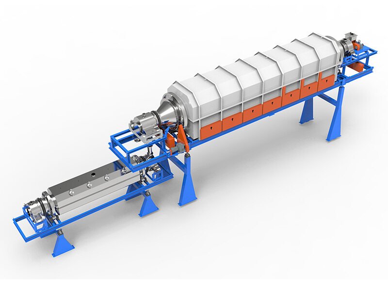 物料由料仓通过进料螺旋进入炉管内,炉管通过传动电机带动旋转,物料在炉管中通过加热段,加热至工艺温度后,由出料斗将物料排出。炉管内可根据客户需求通入不同的工艺气体,尾气中携带的细颗粒物料将由过滤系统分离并收集。