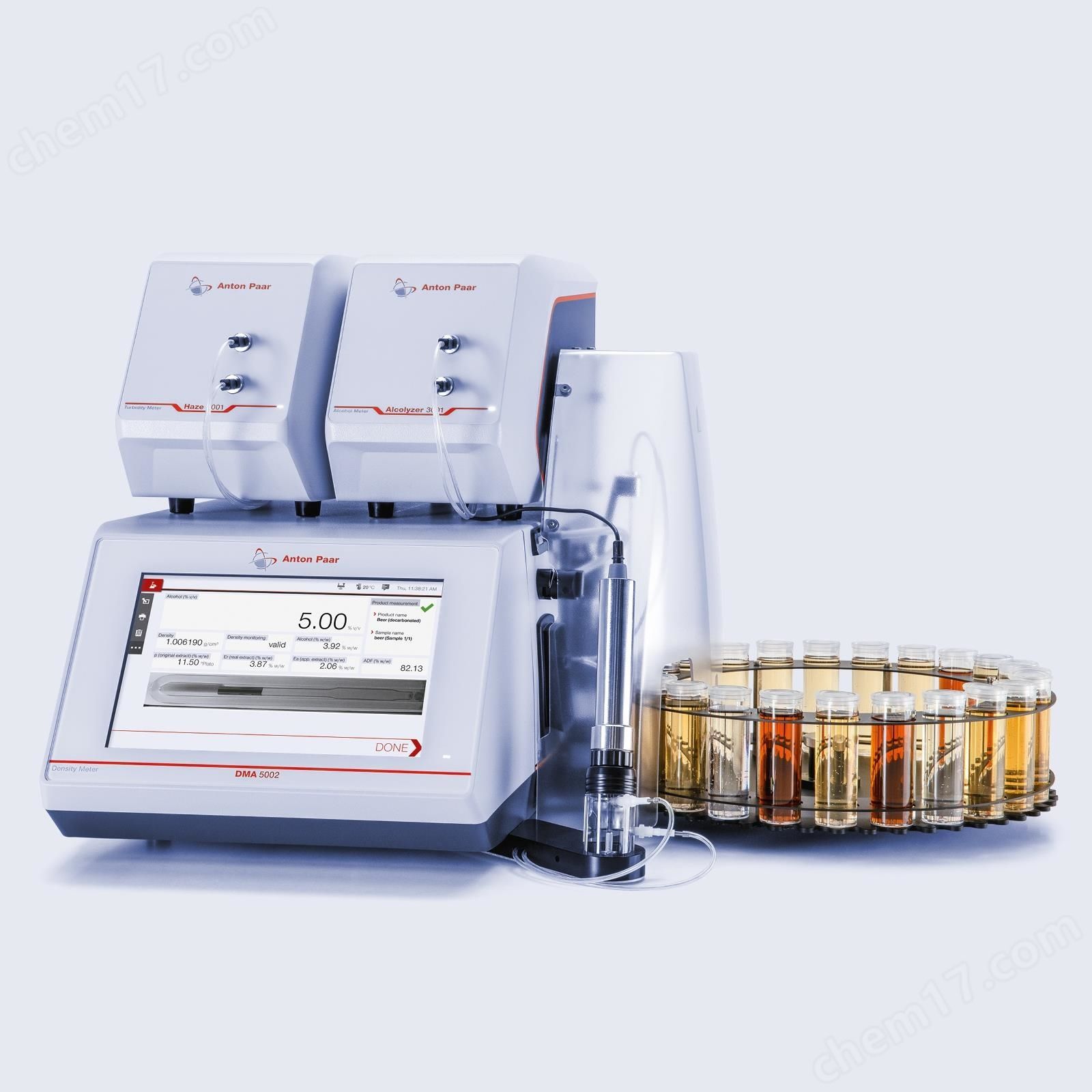 Alcolyzer 啤酒分析系统包括了Alcolyzer 3001酒精分析仪、DMA 5002数字式密度计、Xsample 520 24位自动进样器。