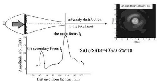 衍射透镜有两个焦距:一个主焦距,一个次焦距。主焦距I1/I的衍射效率是40%,次焦距I2/I的衍射效率<3.6%,这个已经在实验中得到了证明。用自由电子激光器作光源,矩阵探测器来探测的实验已经证明了这一点。