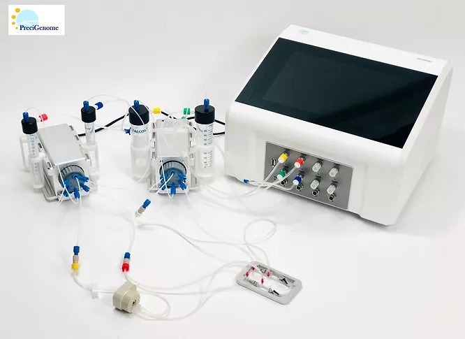 PreciGenome搭建的试剂循环系统,通过阀门切换和流体控制,可实现培养基的定量注入与再循环,且保证在芯片中的流向始终一致。在此系统中,培养基得以循环使用,保证了在循环灌流实验中,由细胞分泌的分子一直都保留在培养基中。