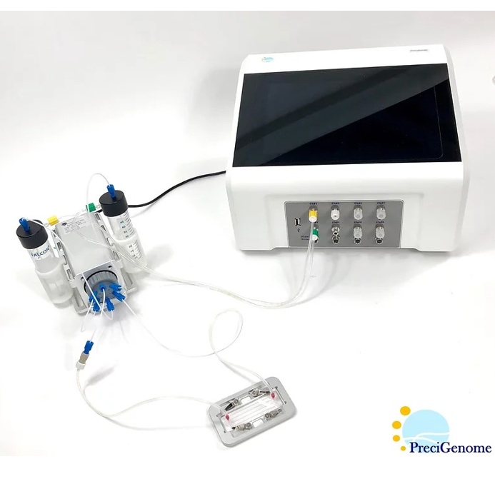 PreciGenome搭建的循环灌流系统,可模拟多种生理流动,如:连续单向流动,振荡流动和脉冲式流动,进一步可控制灌流过程中的微环境(如细胞-细胞和细胞-基质的相互作用),实现微小体积的定量注入培养,并在芯片上集成微系统,有潜力进行更大规模的实验。