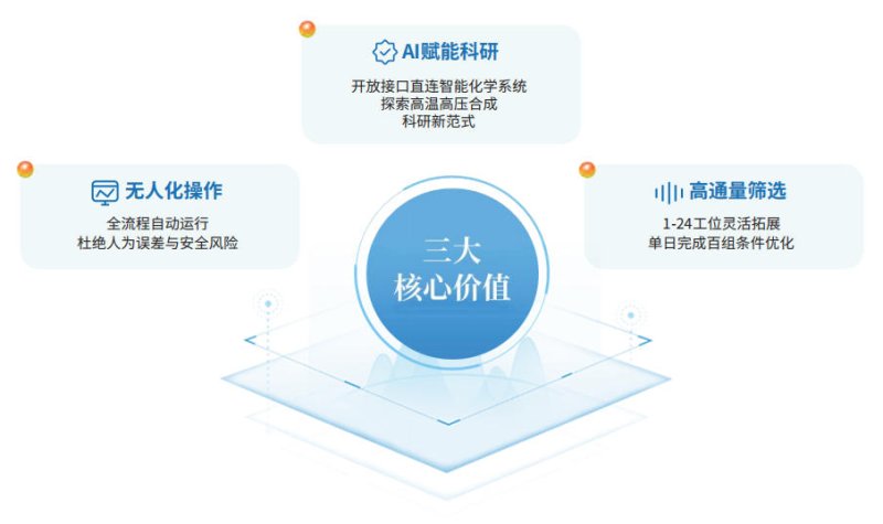 实验前只需将液体、固体反应物加入各釜体中,系统自动将釜体传送至装置内部,通过高精度的机械手系统和自主研发的紧固系统,完成关盖拧紧操作,并按设定的程序检测反应釜的气密性,排除釜内空气并充入指定压力的反应气体。接下来,机械手把反应釜置于加热炉中,并自动开启加热控温程序。反应结束后,机械手可将釜体从加热炉中取出,置于降温工位迅速降温,待温度降低至室温左右,将自动完成釜内压力的安全泄放和自动开盖,并将盛有反应产物的釜体退回至初始位置。