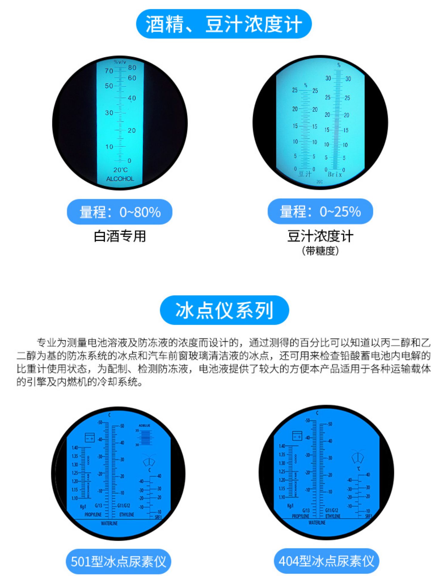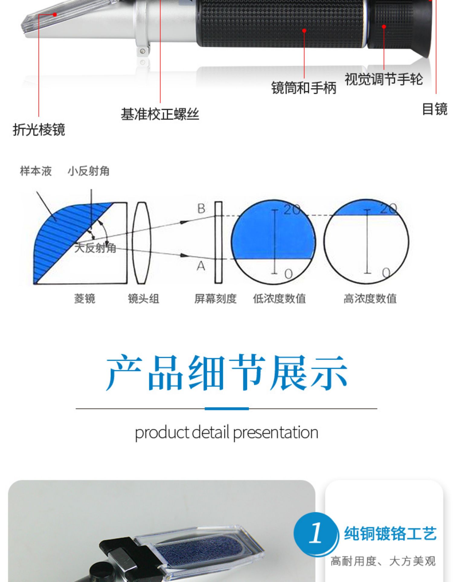 折光仪,又称 折射仪,是利用光线测试液体浓度的仪器,用来测定折射率、 双折率、光性,折射率是物质的重要物理常数之一。许多纯物质都具有一定的折射率,物质如果其中含有杂质则折射率将发生变化,出现偏差,杂质越多,偏差越大。