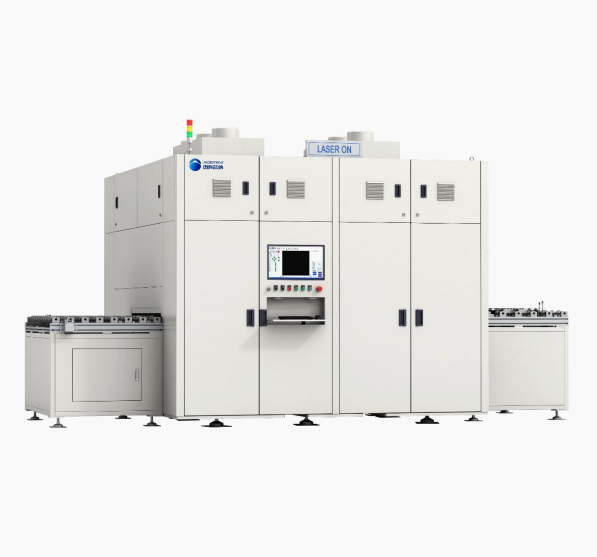 本设备为薄膜太阳能电池专用量产线,适合碲化镉、 钙钛矿电池P0打标、P1-P3划线、P4清边的自动化设 备。